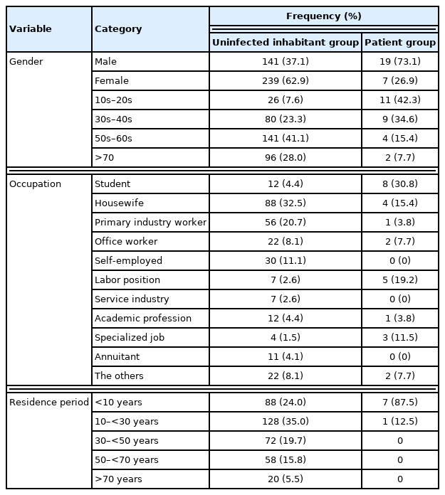 This study was conducted in 2 cities (Gimpo and Paju) in Gyeonggi-do from May to October 2020. The study procedures concerning human sample collection, laboratory investigation, interviews, and questionnaire were reviewed and approved by the Institutional Review Board of Inha University (Approval No. 2020-04-004). This study was conducted according to the principles expressed in the 1964 Helsinki Declaration. The written informed consent was obtained all from the study participants who were informed of their right to refuse to participate and/or to withdraw from the study at any time. For data collection, an interviewer-administrated questionnaire was prepared with reference to the previous literatures. In this study, 406 participants (380 uninfected inhabitants and 26 vivax malaria patients) were interviewed, and the data collected were analyzed. After the questionnaire, the unanswered and dependent data were excluded from the analysis and the statistical package, SPSS program 21.0 version (Statistical Package for Social Science, IBM, Armonk, New York, USA) and R-studio, were used for data coding and cleaning processes. The statistical procedures in this study were performed by ST-Research, Inc. (Busan, Korea).