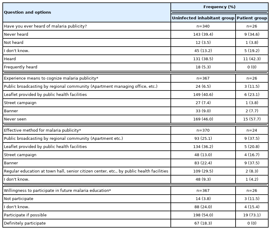 Table 2). The questions used to assess these issues were 1) have you ever heard of malaria publicity? 2) are you aware of means to gain experience to cognize malaria publicity? 3) what are effective methods for malaria publicity? and 4) are you willing to participate in future malaria publicity programs? Multiple choices were provided for some questions in the questionnaire.