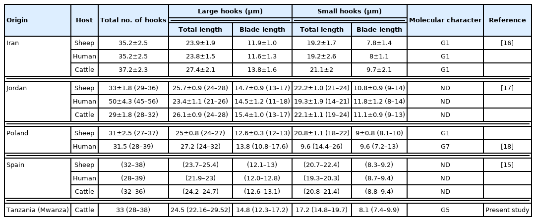 - 15. Gordo FP, Bandera CC. Differentiation of Spanish strains of Echinococcus granulosus using larval rostellar hook morphometry. Int J Parasitol 1997;27:41-49. https://doi.org/10.1016/S0020-7519(96)00173-7