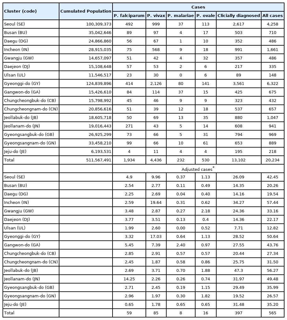 https://kosis.kr/index/index.do. [cited 2021 October]). The geographical locations of the cases were set to the latitude and longitude of administrative center as the search point since the case data were compiled by administrative district unit. The population and number of cases were summed up as accumulated counts and numbers for the total period to evaluate overall malaria status. Case numbers were adjusted for the respected district population (cases/1,000, 000) to facilitate comparison between the districts (