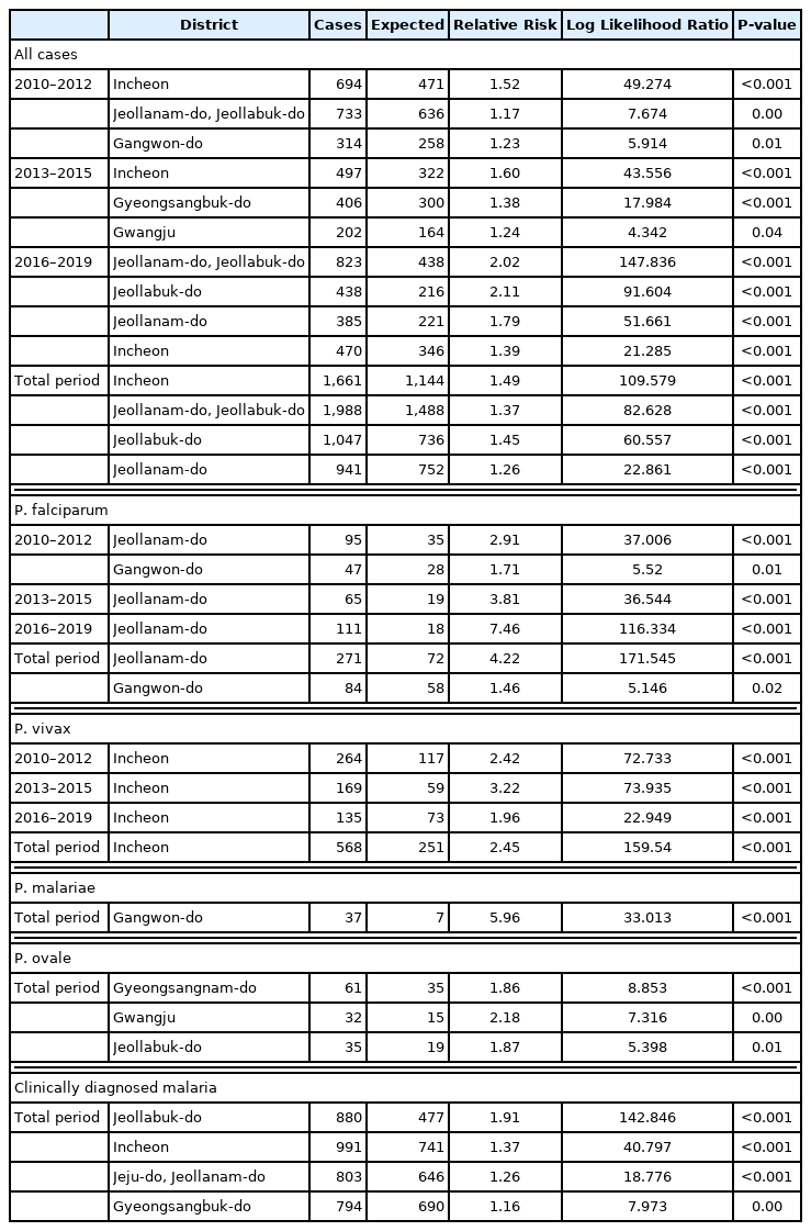 P. falciparum, Jeollanam-do was the MLC (RR=4.22, LLR=171.545) during the whole period. The next likely cluster was Gangwon-do (RR=1.46, LLR=5.146) (