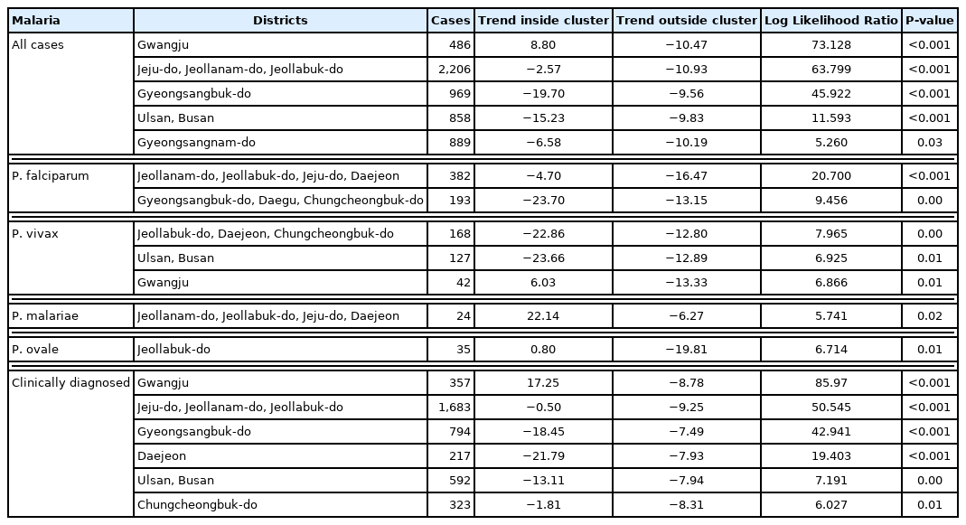 P. falciparum showed decreasing rates in Jeollanam-do/Jeollabuk-do/Jeju-do/Daejeon (−4.70%, LLR=20.700) and Gyeongsangbuk-do/Daegu/Chungcheongbuk-do (−23.70%, LLR=9.456) joint clusters. Other clusters detected by purely spatial analysis showed varying degrees of decreasing rates (