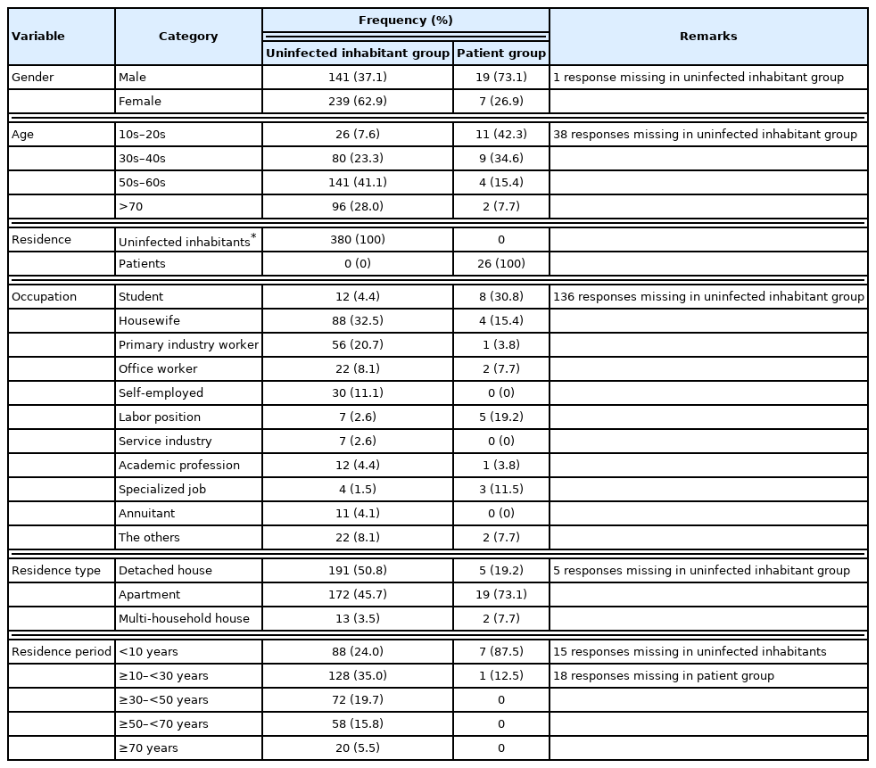 Table 1Socio-demographic characteristics of respondents (uninfected inhabitants and patients) in the cities of Gimpo and Paju, Northern Gyeonggi-do, Korea, 2020 (n=407)