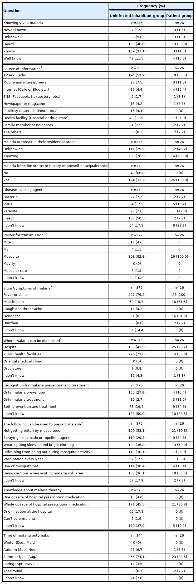 Questions about the features of vivax malaria in Korea consisted of 13 questions about the status of vivax malaria in Korea, the therapeutic situation, the pattern of vivax malaria outbreaks in Korea, the transmission vector, the life cycle of the vector mosquitoes, the incubation period, and immunity. The 13 questions about malaria were scored at 7.6923 each, giving a total score of 100 and were calculated for each respondent.