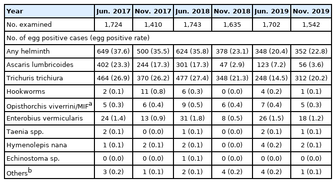 As the egg positive rate of STH, in particular, T. trichiura, revealed no much decrease by the 2 times’ MDAs in 2017, the frequency of MDAs was increased to 3 times in 2018 and 4 times in 2019 (Fig. 2). Follow-up monitoring surveys were performed 2 times a year in 2018 and 2019 (Fig. 2). In June 2018, a total of 1,743 schoolchildren (mean age, 7.0 years; gender ratio M:F=52:48) were examined, and in November 2018, a total of 1,635 schoolchildren (mean age, 7.0 years; gender ratio M:F=49:51) were examined. In June 2019, a total of 1,702 schoolchildren (mean age, 6.8 years; gender ratio M:F=49:51) were examined, and in November 2019, a total of 1,542 schoolchildren (mean age, 8.0 years; gender ratio M:F=50:50) were examined.