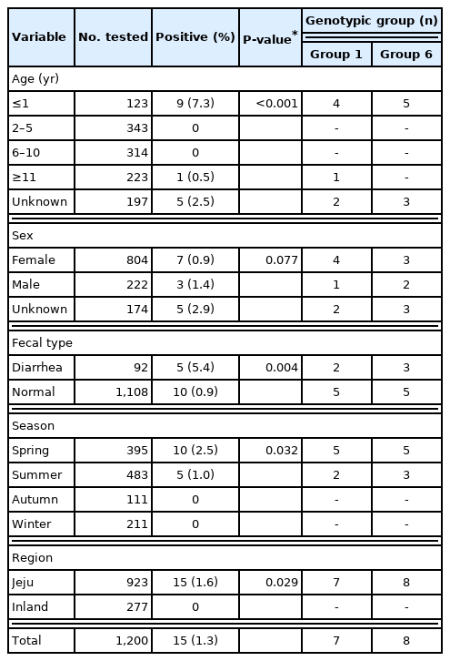 Table 1). It was low compared with the infection rate in other animals previously studied in Korea. The infection was reported in animals such as Korean water deer 53.6%, raccoon dogs 35.4%, calves 16.9%, cattle 14.9%, piglets 14.2%, bats 5.2%, cats 3.8%, and wild boar 2.6% [