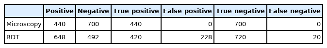 Table 1 shows a comparison of microscopic and RDT results. For microscopy, 440 samples tested were positive and 700 were negative. A total of 648 samples were positive and 492 were negative by RDT. Among the 440 positive cases diagnosed by microscopic examination, RDT failed to detect 20 cases. Out of the 700 negative cases by microscopic examination, 228 showed a positive reaction by RDT yielding 228 false positive results.