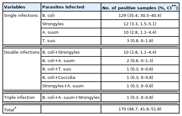 Our fecal examination showed that 170 (46.7%) of the 364 swine samples were infected with at least 1 gastrointestinal parasite, including