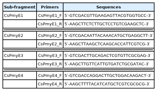 CsPmyE4 CsPmyE4_F 5′-GTCGACCAGGACTTGCTGGACAAGACT-3′
