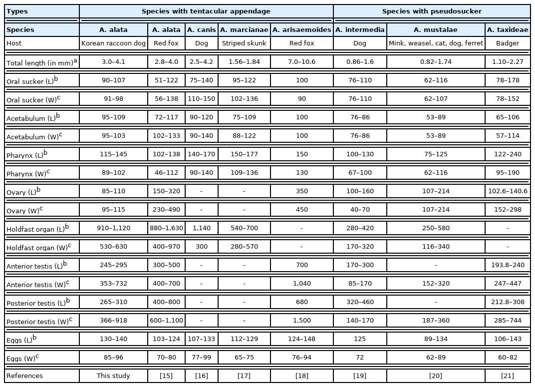 The measurements of Alaria species are summarized in Table 1. In the total body length of Alaria species, A. alata 2,800–4,000 μm [15], A. canis 2,500–4,200 μm [16], and A. marcianae 1,560–1,840 μm [17]. In this study, body length (3,020–4,090 μm) is larger than that of A. marcianae, but similar to A. alata and A. canis. And the vitellaria of A. canis is distributed beyond the forebody to the hindbody, while the vitellaria of A. alata is distributed only in the forebody [17]. In this study, vitelline follicles are distributed in the forebody, which are similar to those observed in A. alata [15].
