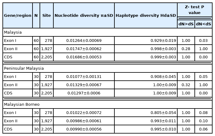 The test on natural selection of Peninsular Malaysia and Malaysian Borneo sequences showed relatively similar results. The overall Z-test indicated that Peninsular Malaysia and Malaysian Borneo exon I (dN<dS, P=0.05 and P=0.08 respectively), CDS (dN<dS, P=0.00 and P=0.06 respectively) and Peninsular Malaysia exon II (dN<dS, P=0.10) were possibly shifting towards negative selection. Tajima’s D statistic did not show any significant departure from neutrality in the Peninsular Malaysia and Malaysian Borneo exon I (−0.87733 and −0.20215, P>0.10), exon II (−0.67215 and −1.20998, P>0.10) and CDS (−0.71063 and −1.11684, P>0.10).