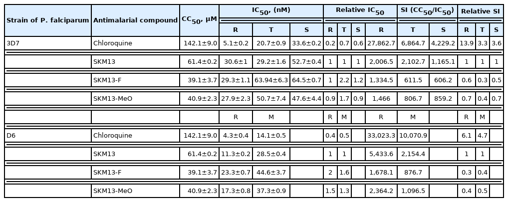 SKM13 and its derivatives showed different antimalarial activities depending on the P. falciparum strains. SKM13 showed IC50 values of 30.6±1, 29.2±1.6, and 52.7±0.4 (mean±SD) at the ring, trophozoite, and schizont stages, respectively, indicating that it was more effective at the ring and trophozoite stages than at the schizont stage (Fig. 2A-C). SKM13-MeO and -F showed higher IC50 values than SKM13 at all 3 stages, implying that SKM13 was more effective than 2 novel derivatives at inhibiting all stages of P. falciparum 3D7. The final SI (CC50/IC50) showed an approximately 2-folds lower value for 2 derivatives of SKM13 than SKM13 itself, suggesting that 2 novel derivatives are less effective than SKM13. There was no difference in SI values between 2 novel SKM13 derivatives.