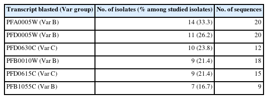 PfDBLα-encoding sequences were identified. Transcripts from the DBLα groups A, B, C, B/A, and B/C were detected in isolates, and those from groups B and C were mostly shared. The highly dominant DBLα sequences were confirmed to belong to