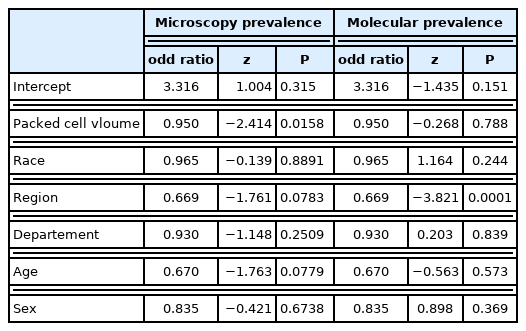 For molecular diagnostics, the model with packed cell volume (PCV), race, region, age, and sex (AIC=466.98) was the best model than that one with PCV, race, region, department, age, and sex (AIC=468.94). According to this model, it is only the region (P<0.001) that showed a highly significant association between animal infection with race, region, age, and sex (Table 2).