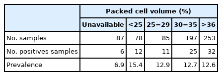 The overall average of PCV was 35.3%±12.53%. The minimum and maximum observed were 10% and 90%, respectively. A significant difference (P<0.01) was observed between the PCV classes (Table 3). Animals with a PCV<25 were more prevalent than those with a PCV>25.