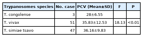 Trypanosomes species No. case PCV (Mean±SD) F P