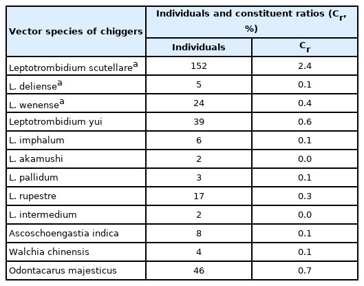 Leptotrombidium deliense, which accounted for 2.4% (152/6,384), 0.4% (24/6,384), and 0.1% (5/6,384) of the total (6,384) identified chiggers, respectively (