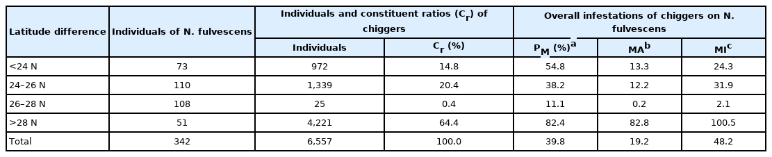 N. fulvescens is of medical importance, few scholars have studied the model of chigger infestation patterns on this species. Here, we retrospectively assessed the disease vector occurrence and ecological characteristics of chiggers living on