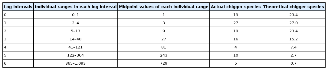 In the above equation, Ŝ(R)=the number of theoretical species at the R-th log interval, S(R)=the number of actual chigger species at the R-th log interval, R=log interval R, R0= the mode log interval, S0=the number of chigger species at R0 log interval, β=the spread constant of distribution, n=the number of log intervals, and ST=the estimated number of chigger species on N. fulvescens. The β value was determined according to the best coefficient of determination (R2).