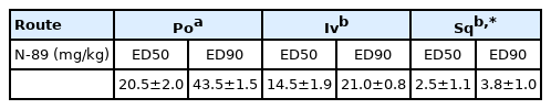 The N-89 antimalarial activity was examined by different routes, specifically, po, iv, and sq. The ED