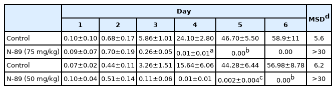 Table 3Parasitemia of oral N-89 treated mice from days 1 to 6