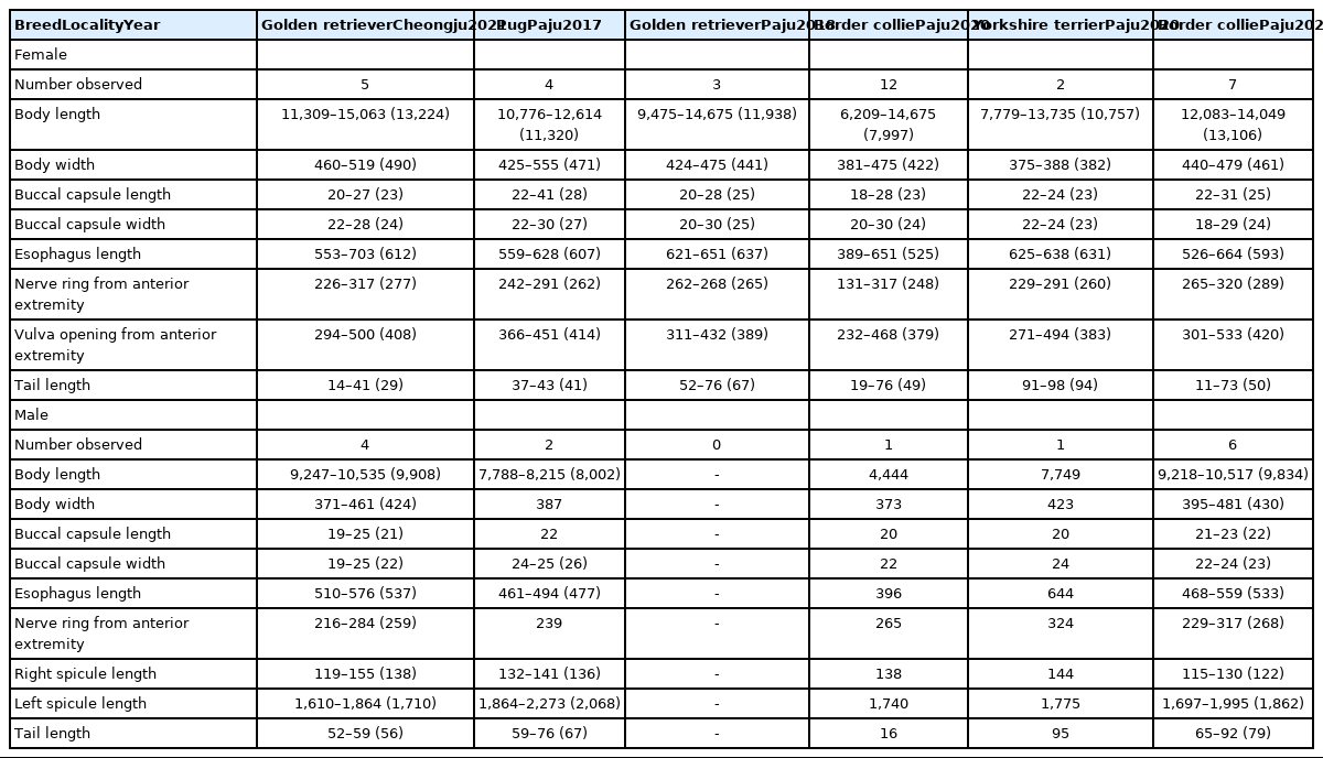 Worms were identified through observations of the morphological characteristics and measurements of morphometric features using a light microscope (BX53, Olympus, Tokyo, Japan). The specimens were cleared with lactophenol solution, and placed on the slide glass with cover slip before being observed under the light microscope. Specimen measurement used 9 of 19 worms isolated in Cheongju and 37 of 47 worms isolated in Paju among the 61 worms collected from 8 dogs.