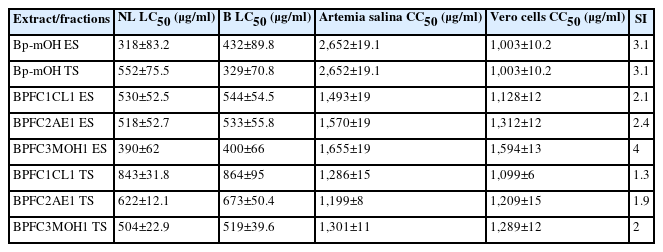 Furthermore, due to the initial mild to moderate toxicity results, a cytotoxic assay was conducted. In brief, the toxicities of the plant extract and fractions (Bp m-OH) were assessed in Vero cells (ATCC, CCL-81) using the MTT assay as previously described [