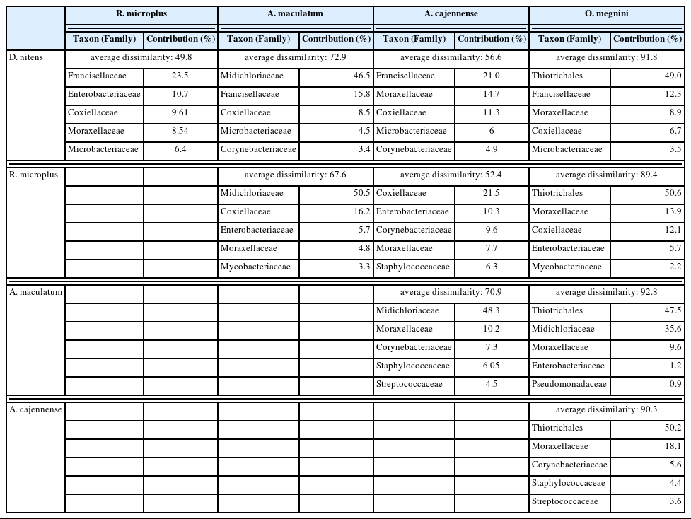 t-test was performed to compare diversity among species, localities, and sexes. SIMPER analysis was performed to determine the main families that contributed to the dissimilarity in microbiome diversity among tick species. Principal coordinate analyses (PCoAs) were performed on the basis of Bray–Curtis distances and visualized using three-dimensional plots in EMPeror (a part of QIIME). Taxonomies with significant abundance among different groups were identified via linear discriminant analysis effect size (LEfSe) using default settings [