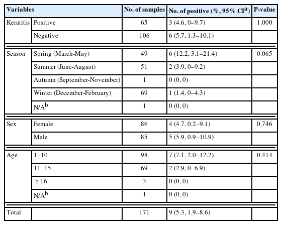 Table 1Prevalence of Acanthamoeba spp. in dogs collected at Chungbuk National University Veterinary Teaching Hospital, Korea regarding keratitis, season, sex, and age