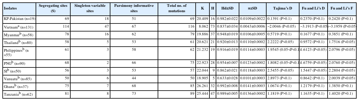 pfama-1 sequences deposited in GenBank were also included for analysis: Thailand (AB715735–AB715814), Myanmar (KU893276–KU893333), Philippines (AB715815–AB715869), Vietnam (MW938322–MW938452), Vanuatu (AB716010–AB716094), Solomon Islands (SI; AB715960–AB716009), Papua New Guinea (PNG; AB715870–AB715959), Ghana (AB715698–AB715734), and Tanzania (AB715636–AB715697) (