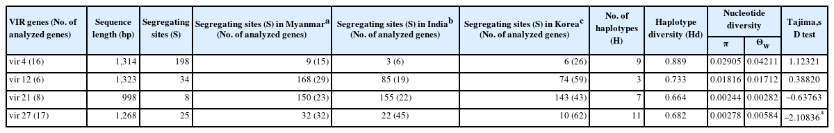 VIR genes (No. of analyzed genes) Sequence length (bp) Segregating sites (S) Segregating sites (S) in Myanmara (No. of analyzed genes) Segregating sites (S) in Indiab (No. of analyzed genes) Segregating sites (S) in Koreac (No. of analyzed genes) No. of haplotypes (H) Haplotype diversity (Hd) Nucleotide diversity Tajima,s D test