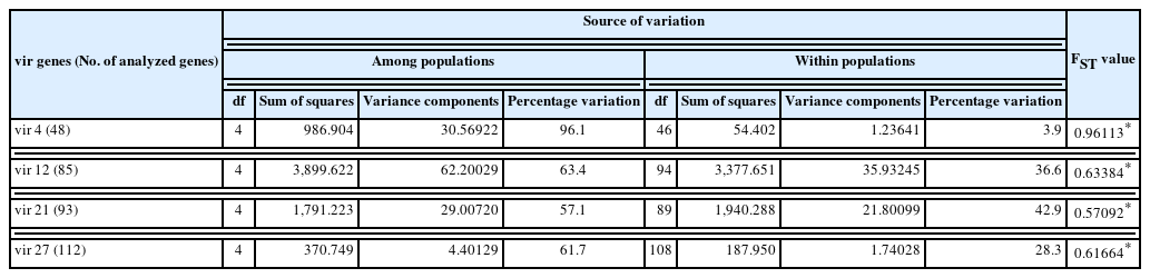 Analysis of molecular variance in populations of vir genes from Asian countries