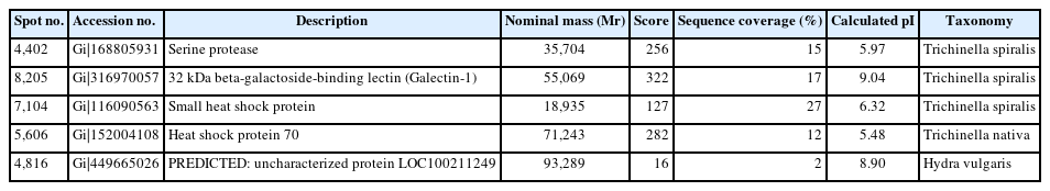 We identified 5 spots that are specific to T. spiralis as serine protease, Galectin-1, small heat shock protein, heat shock protein 70, and uncharacterized protein LOC100211249. However, only the first 4 proteins are associated with T. spiralis, while the uncharacterized protein LOC100211249 belongs to Hydra vulgaris.
