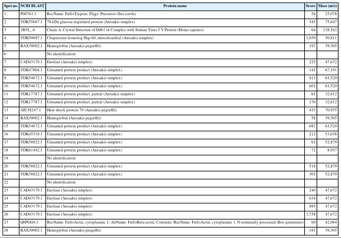 - 37. González-Fernández J, Daschner A, Nieuwenhuizen NE, Lopata AL, Frutos CD, et al. Haemoglobin, a new major allergen of Anisakis simplex. Int J Parasitol 2015;45(6):399-407.