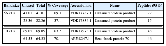 A. pegreffii. Protein extraction from the remaining 135 larvae was performed using sonication, followed by centrifugation at 10,000×g for 30 min and filtration through a sterilized 0.22-μm filter (Merck Millipore, Darmstadt, Germany). The protein concentration was determined using the Bradford assay (Bio-Rad, Hercules, CA, USA). The extract was maintained on ice throughout the extraction process and stored at −80°C.
