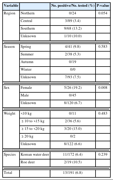 P=0.008), although the sex of eight of the infected deer was unknown. Deer thrives in the southern region had a higher infection rate (13.2%) and in the spring season (9.7%), but not statistically significant (
