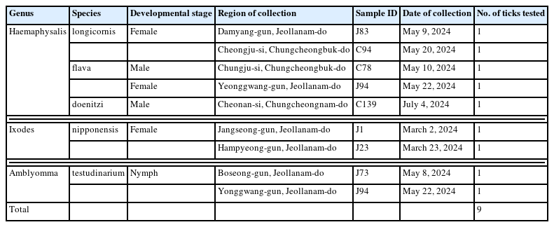 Nine ticks collected in 2024 from 4 provinces in Korea (Chungcheongbuk-do, Chungcheongnam-do, Jeollabuk-do, and Jeollanam-do) were analyzed. The ticks were collected from vegetation using the flagging method and stored in 70% ethanol at room temperature until morphological identification and DNA extraction. Morphological identification was performed using a microscope according to the identification standards [