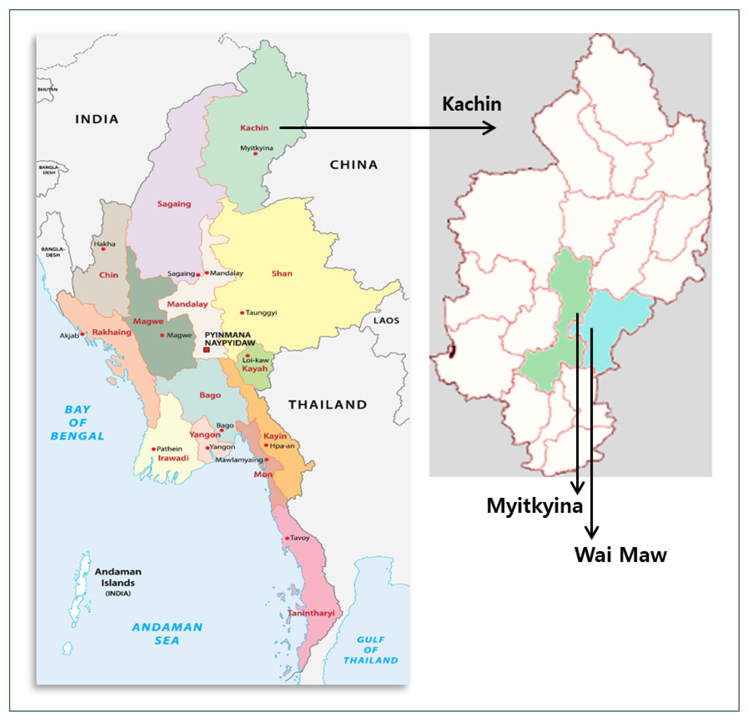 The map of the Myanmar blood collection regions: the Myitkyina and Wai Maw townships in Kachin State.