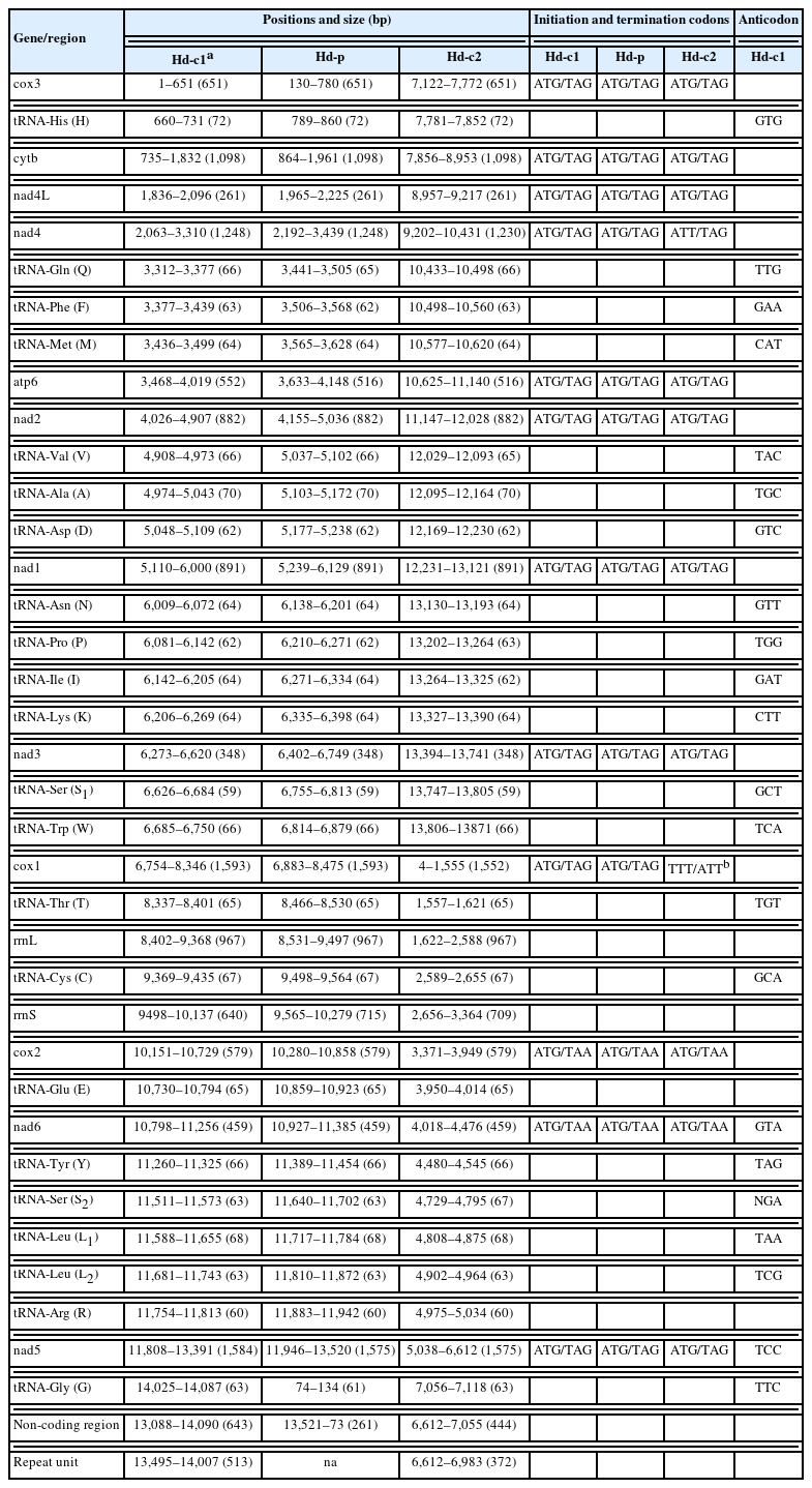aHd-c1 mitogenome begins at 1 bp while Hd-p and Hd-c2 mitogenomes start at 130 bp and 7,122 bp, respectively;