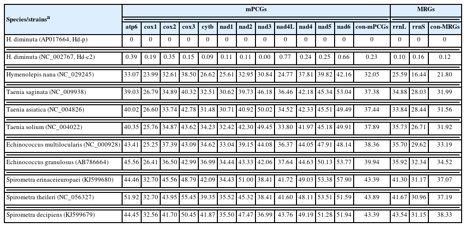 | Hymenolepis nana (NC_029245) | 33.07 | 23.99 | 32.61 | 38.50 | 26.62 | 25.61 | 32.95 | 30.84 | 24.77 | 37.81 | 39.82 | 42.16 | 32.05 | 25.59 | 16.44 | 21.80 |