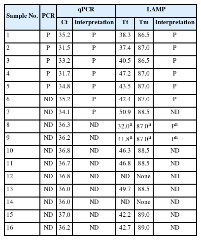- 16. Nagamine K, Hase T, Notomi T. Accelerated reaction by loop-mediated isothermal amplification using loop primers. Mol Cell Probes 2002;16:223-9. https://doi.org/10.1006/mcpr.2002.0415