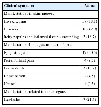 Because patients with immunodeficiency were not included, clinical manifestations primarily involved the gastrointestinal tract and the skin/mucous membranes. The most common symptoms were itching (88.1%), urticaria (42.9%), epigastric pain (40.5%), headache (21.4%), and loose stools (16.7%) (