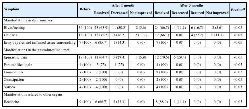 After 1 month of treatment, symptom persistence was uncommon: itching did not improve in 2/36 patients (5.6%), and abdominal pain did not improve in 1/17 patients (5.9%); all other symptoms resolved (