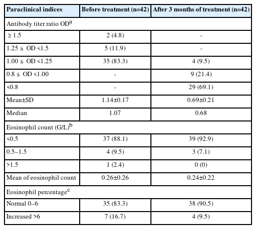 Data were extracted from medical records and stored in Microsoft Excel 2019 (Microsoft Corp.). Statistical analyses were performed using IBM SPSS Statistics version 22 (IBM Corp.). Symptom changes were analyzed using the McNemar test. Changes in OD titers and eosinophil counts were assessed using the paired t-test or Wilcoxon signed-rank test, as appropriate. Treatment effectiveness was evaluated by comparing proportions of cured, reduced, and not cured cases before and after treatment using the McNemar test.