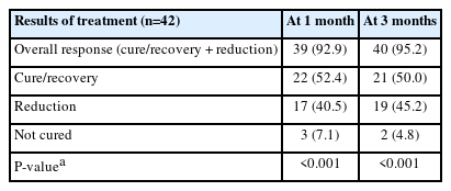 Regarding symptom response, at 1 month after treatment, 22 patients (52.4%) reported complete symptom resolution, 17 (40.5%) reported partial symptom relief, and 3 (7.1%) reported no improvement (