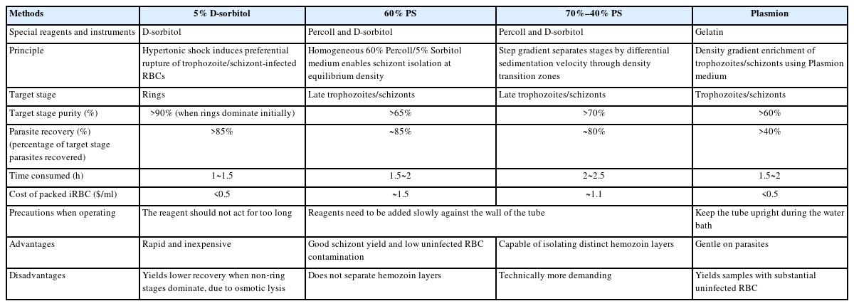Fig. 2C). The Percoll-based approaches utilize discontinuous density gradients to stratify infected erythrocytes based on parasite maturation. The 60% PS method yields 2 distinct layers after centrifugation: an upper layer enriched in late-stage infected erythrocytes with schizonts (32–48 h) accounting for approximately 67.57% and a pellet containing predominantly ring-stage (0–18 h) parasites (90.44%) (