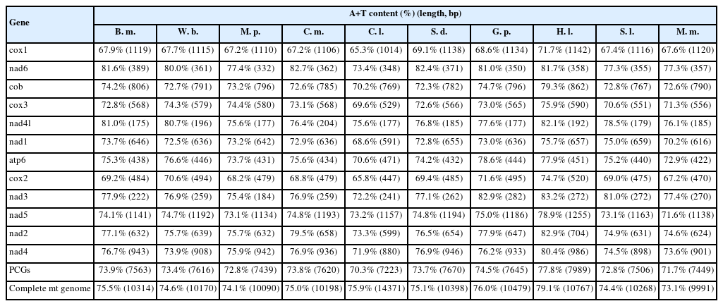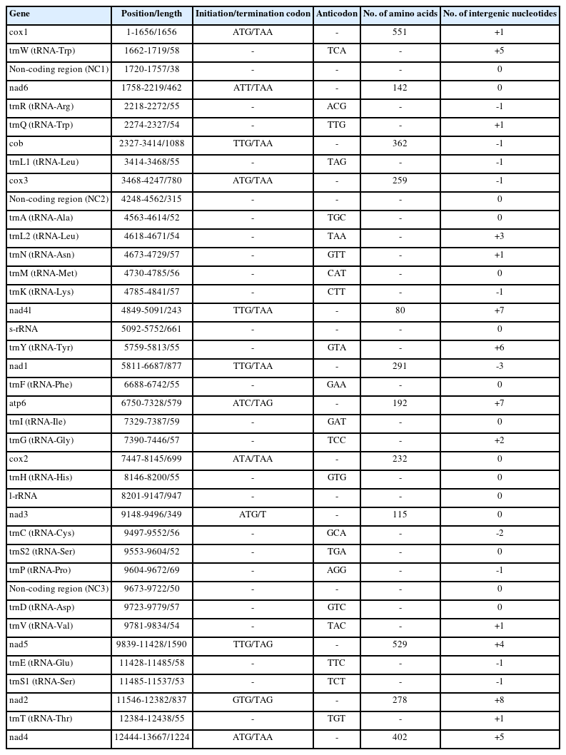 20]. All genes were transcribed unidirectionally from the plus strand. The nucleotide composition was 21.1% A, 52.0% T, 7.1% C, and 19.8% G, with an overall AT content of 73.1% and GC content of 26.9%. The mitogenome exhibited negative AT skew (-0.422) and positive GC skew (0.470).