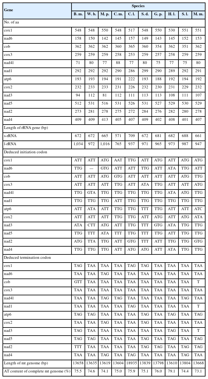 - 9. Humphreys-Pereira DA, Elling AA. Mitochondrial genomes of Meloidogyne chitwoodi and M. incognita (Nematoda: Tylenchina): comparative analysis, gene order and phylogenetic relationships with other nematodes. Mol Biochem Parasitol 2014;194:20-32. https://doi.org/10.1016/j.molbiopara.2014.04.003