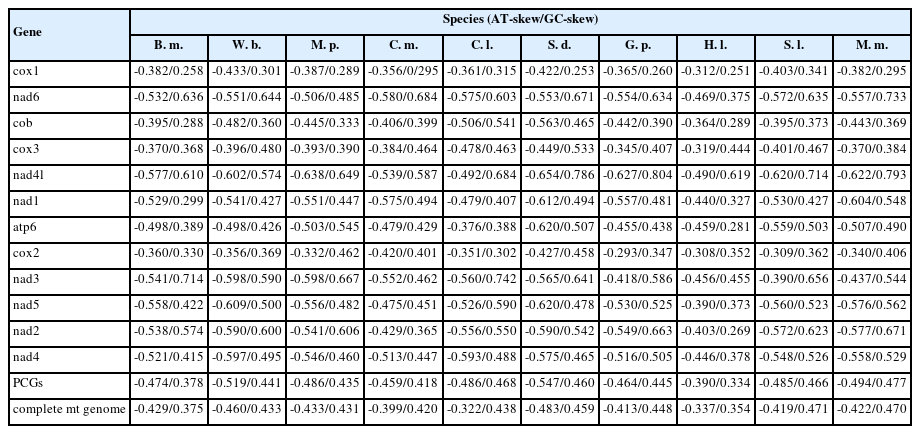 19]. In addition, the boundaries of rRNA genes were determined based on the locations of adjacent tRNA genes and by alignment with homologous genes of other related nematodes using DNAMAN version 8.0 (Lynnon Biosoft). The composition skew values were calculated according to the following formulae: AT skew=(A-T)/(A+T) and GC skew=(G-C)/(G+C) [