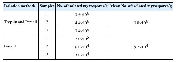 Fig. 1). The mean number of myxospores isolated by the trypsin and Percoll method was 3.8×10